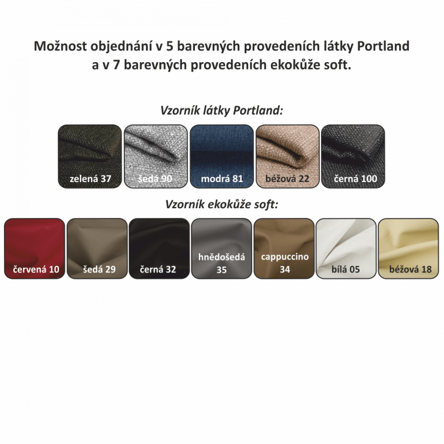 Upozorňujeme, že při objednávkách na nábytek v jiném barevném provedení, jak máme běžně skladem, neumíme zaručit doručení do Vánoc. Totéž platí i při nábytku označeném na objednávku. Možnost objednání v 7 barevných provedeních ekokůže Soft a v 5 barevných provedeních látky Portland v ceně 24.760 Kč. Dodací lhůta 14-17 týdnů.