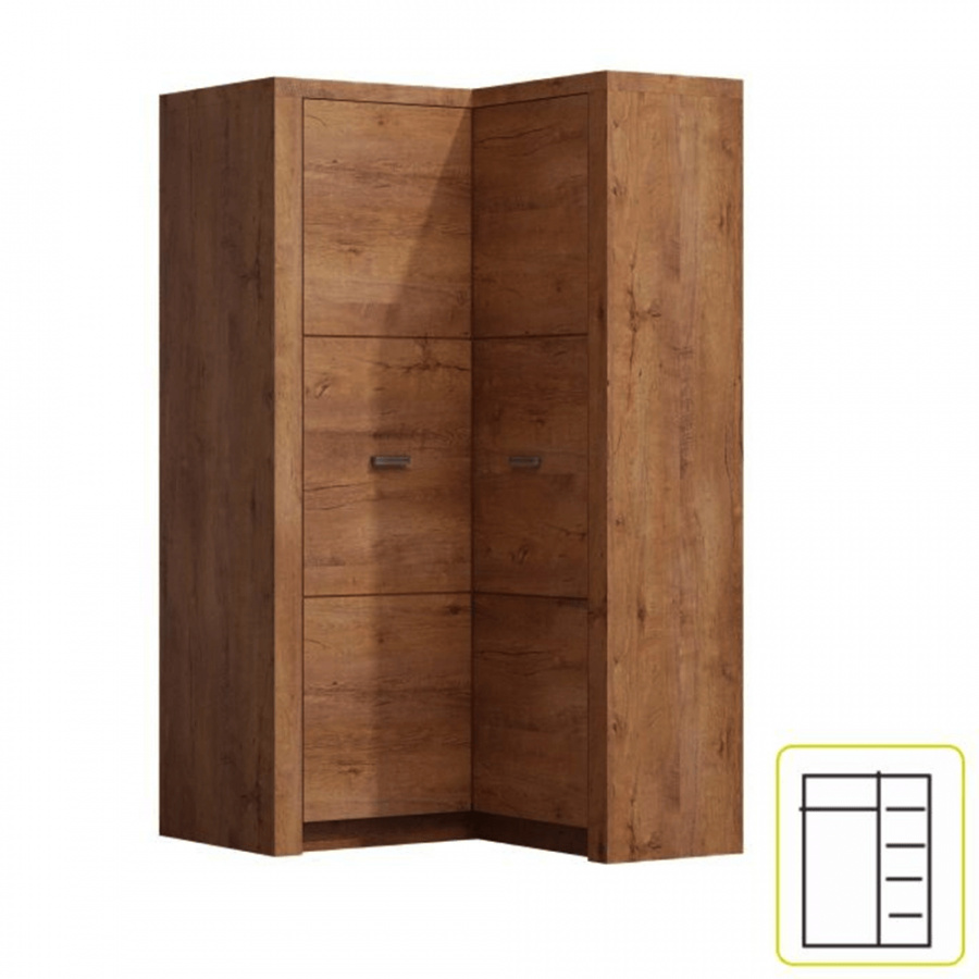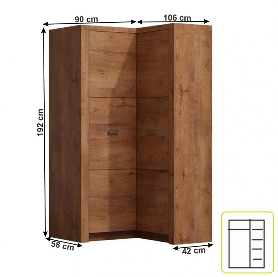 Rohová skříň INFINITY 14 Korpus hrubý až 48 mm, Tloušťka materiálu zbývající části: 16 mm, úchytky kovové Materiál DTD laminovaná, ABS hrany, barevné provedení: jasan světlý, Rozměry ŠxHxV: 90 / 106x58 / 42x192 cm. Dodávané v demontu.