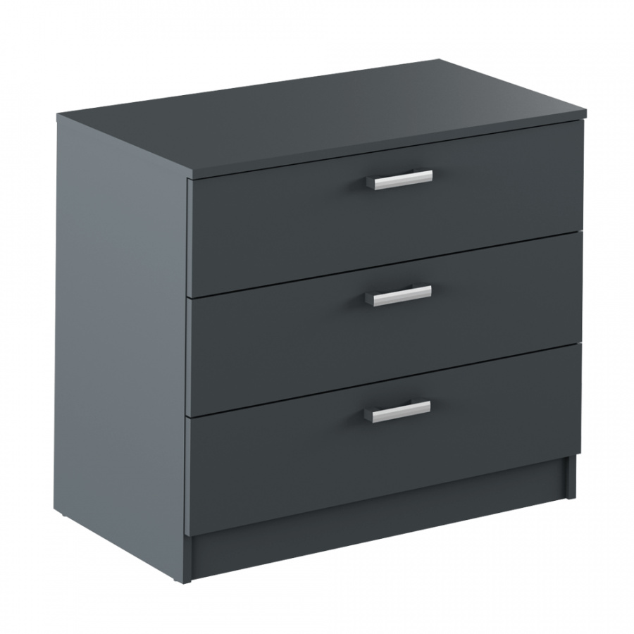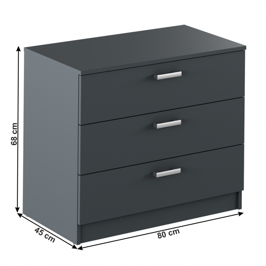 Komoda ALEXIA Materiál: DTD laminovaná Provedení: šedá grafit Rozměry (ŠxHxV): 80x45x68 cm 3 šuplíky kovové úchytky moderní design Kvalitní slovenský výrobek Dodávané v demontu.