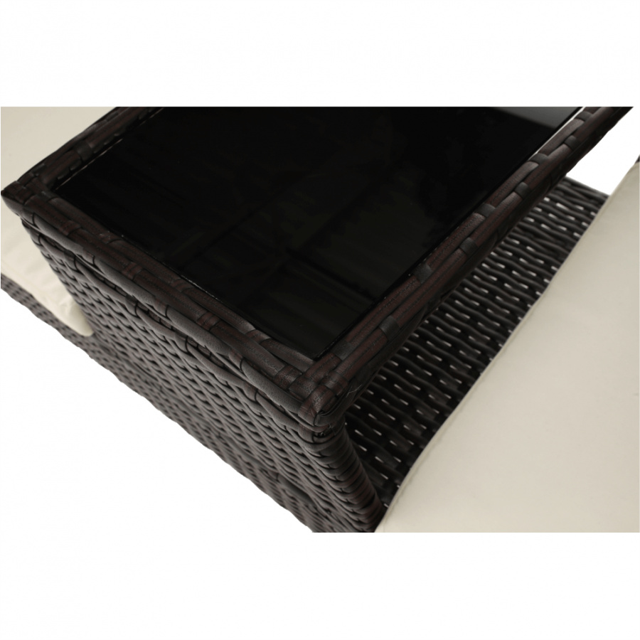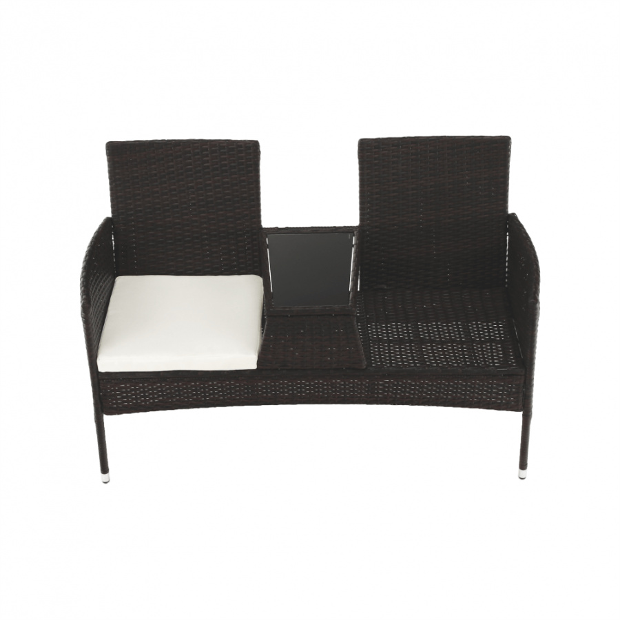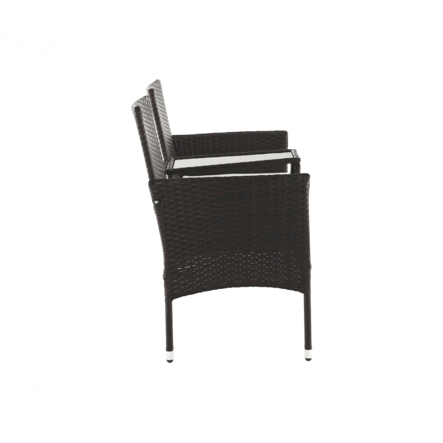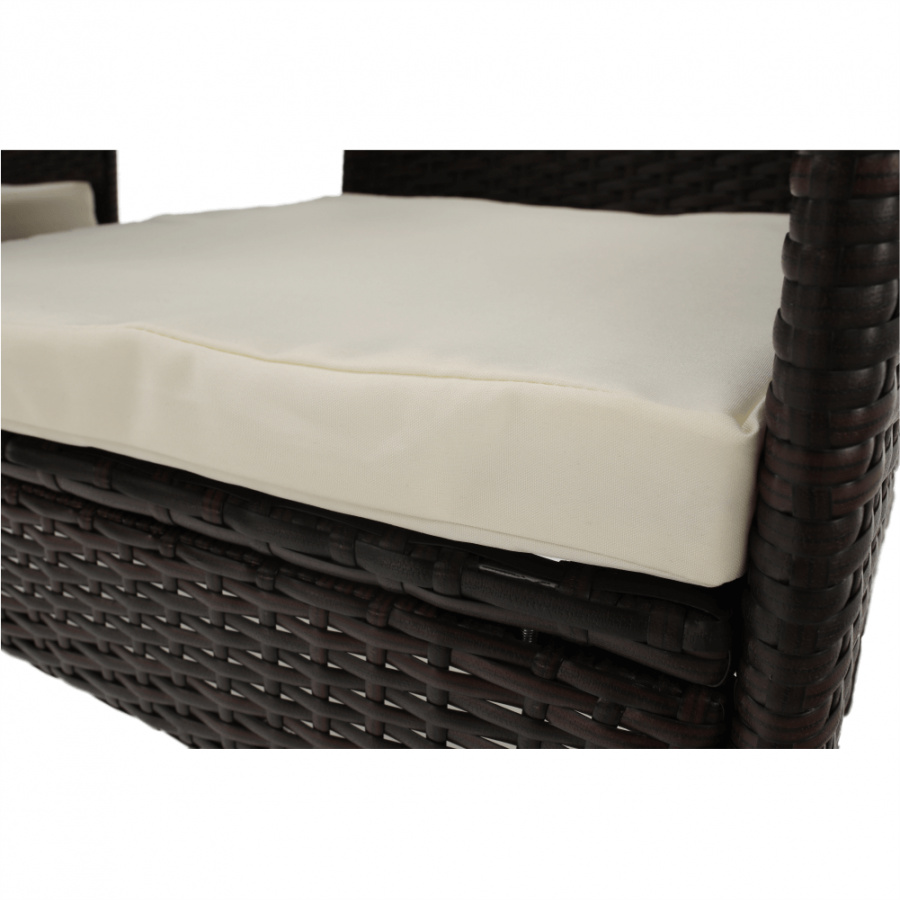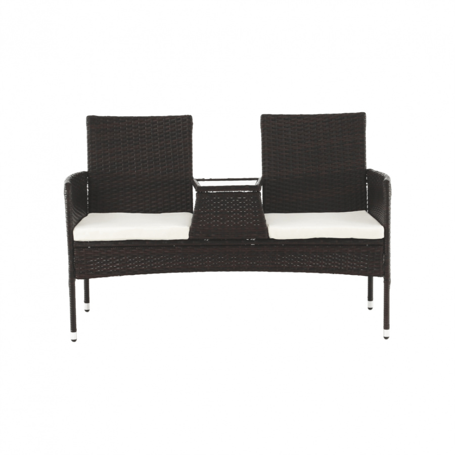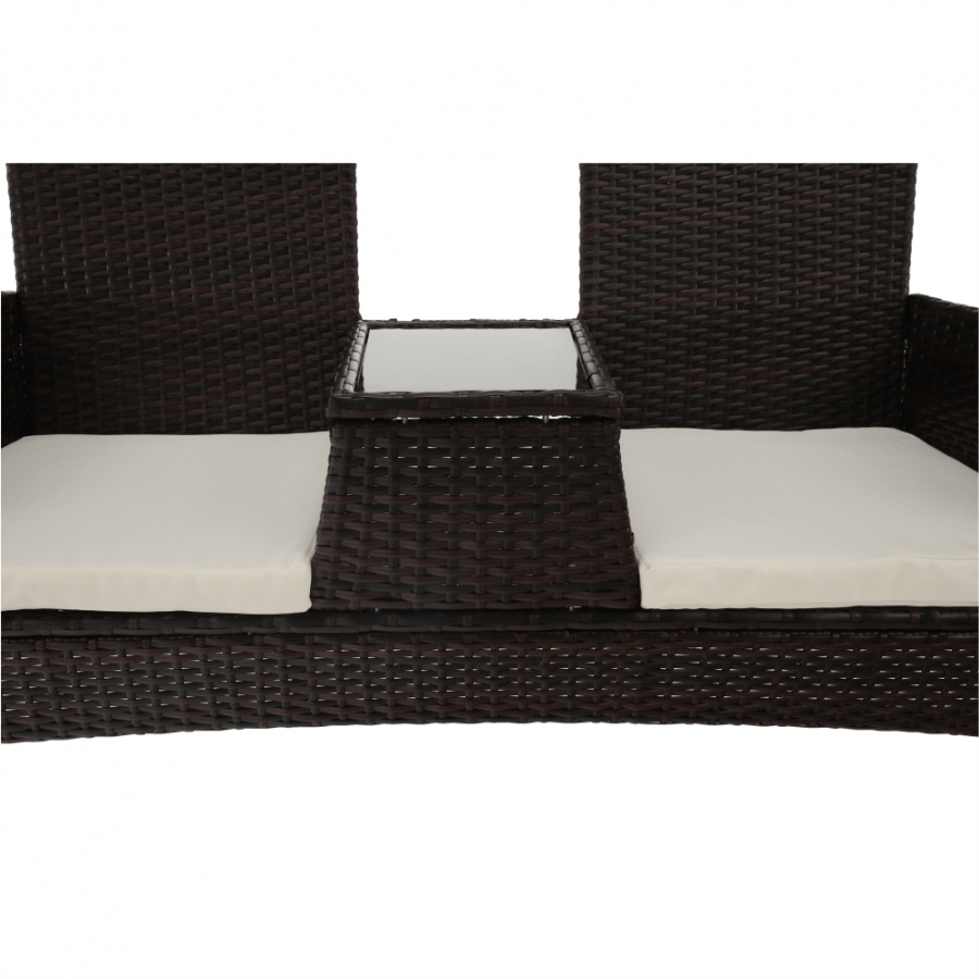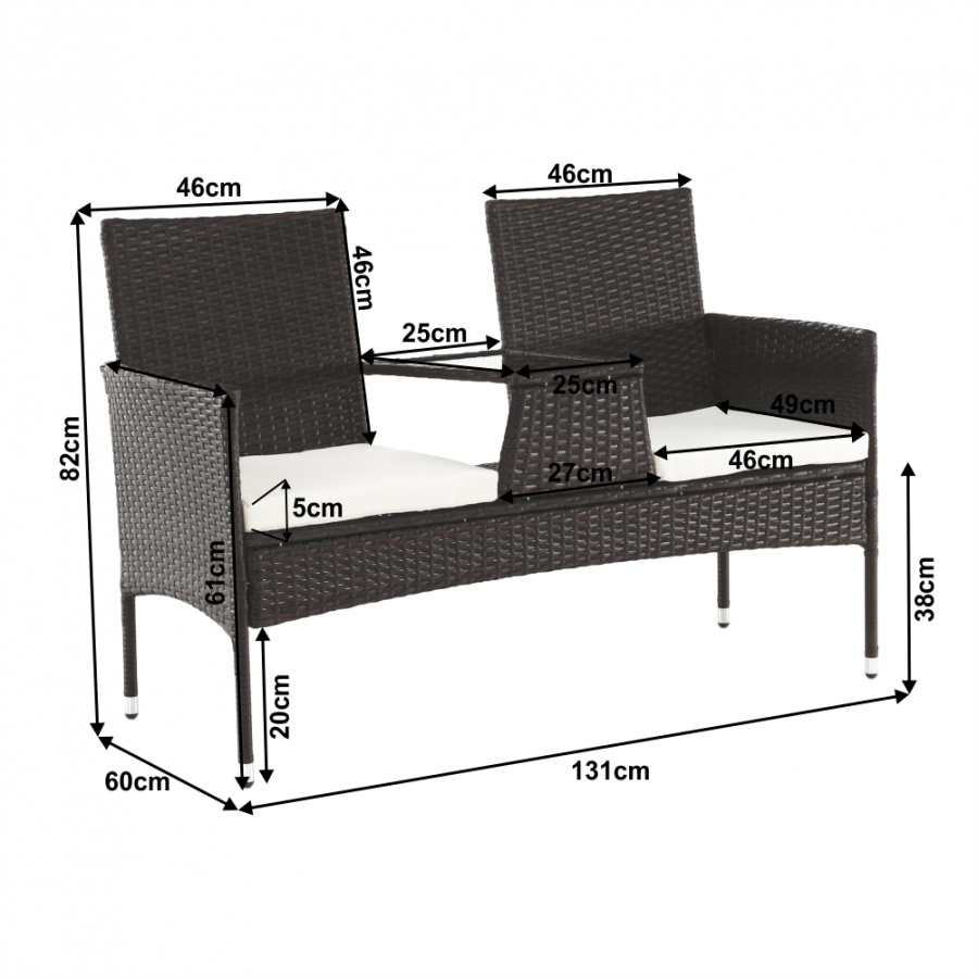 Materiál: umělý ratan / ocel / tvrzené sklo / látka Barva: hnědá / krémová Rozměry (ŠxHxV): 131x60x82 cm Stůl (ŠxH): 25x51 cm Výška nohy: 20 cm Výška sedu: 38 cm Tloušťka polštáře: 5 cm Rozměry sedu (ŠxH): 46x49 cm Opěrka na ruku (HxV): 54x61 cm Opěrka zad (ŠxV): 46x46 cm voděodolný potah snímatelný potah Možné je prát ho v pračce Dodávané v demontu