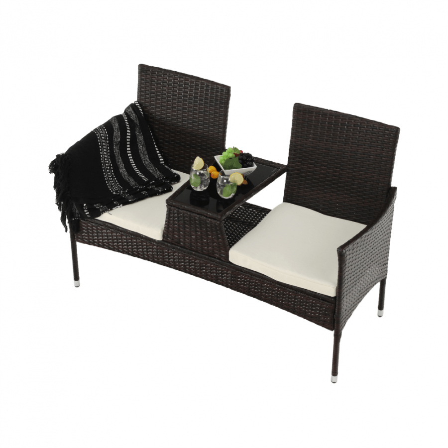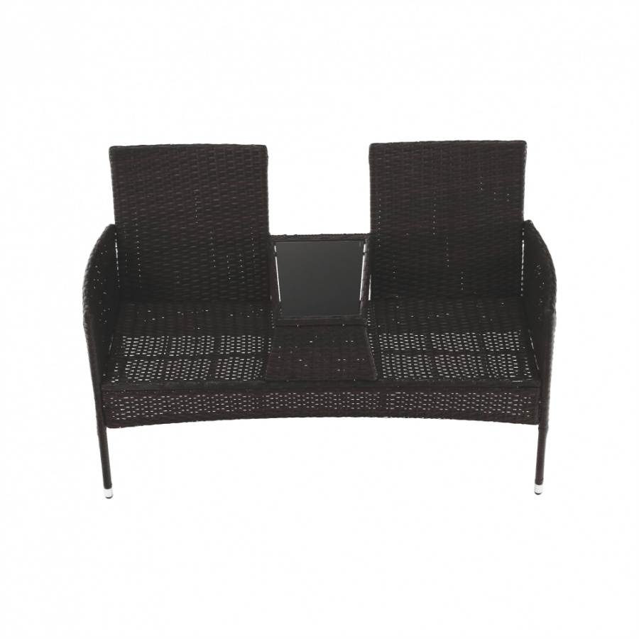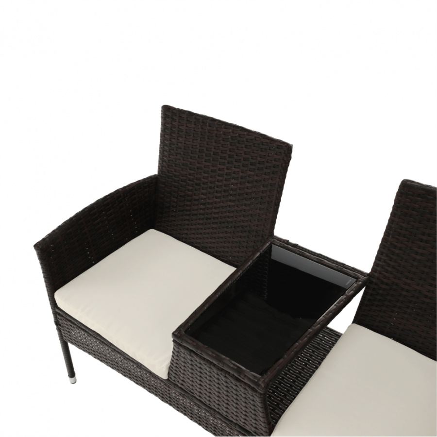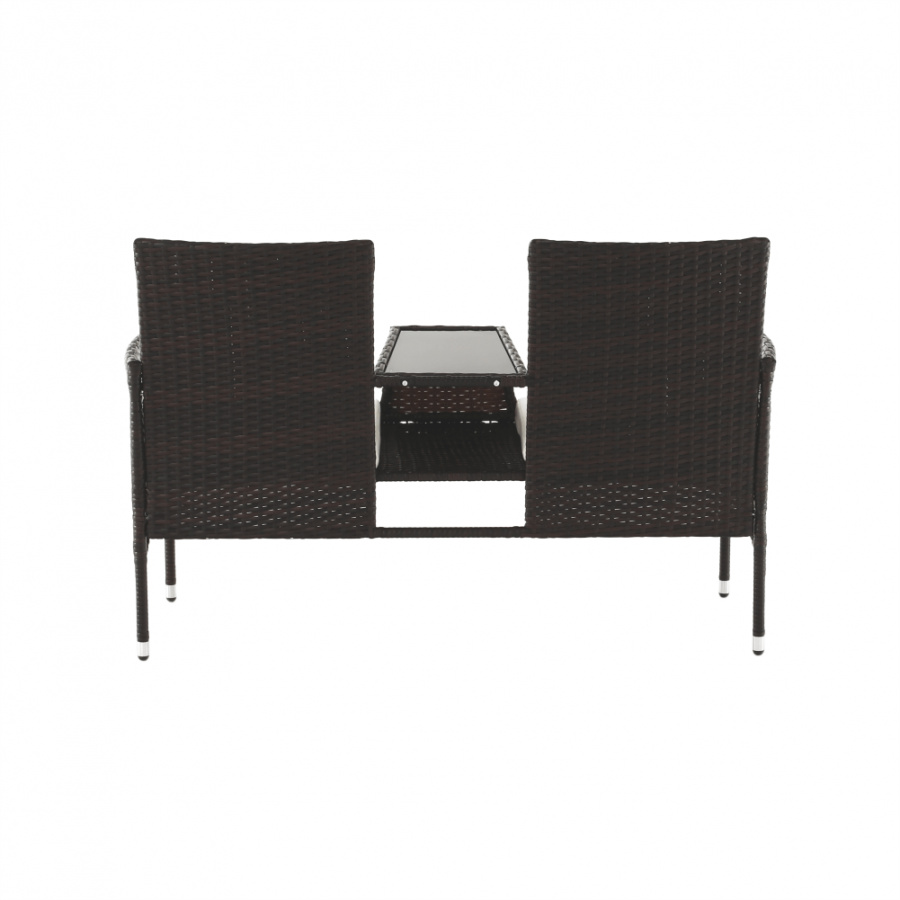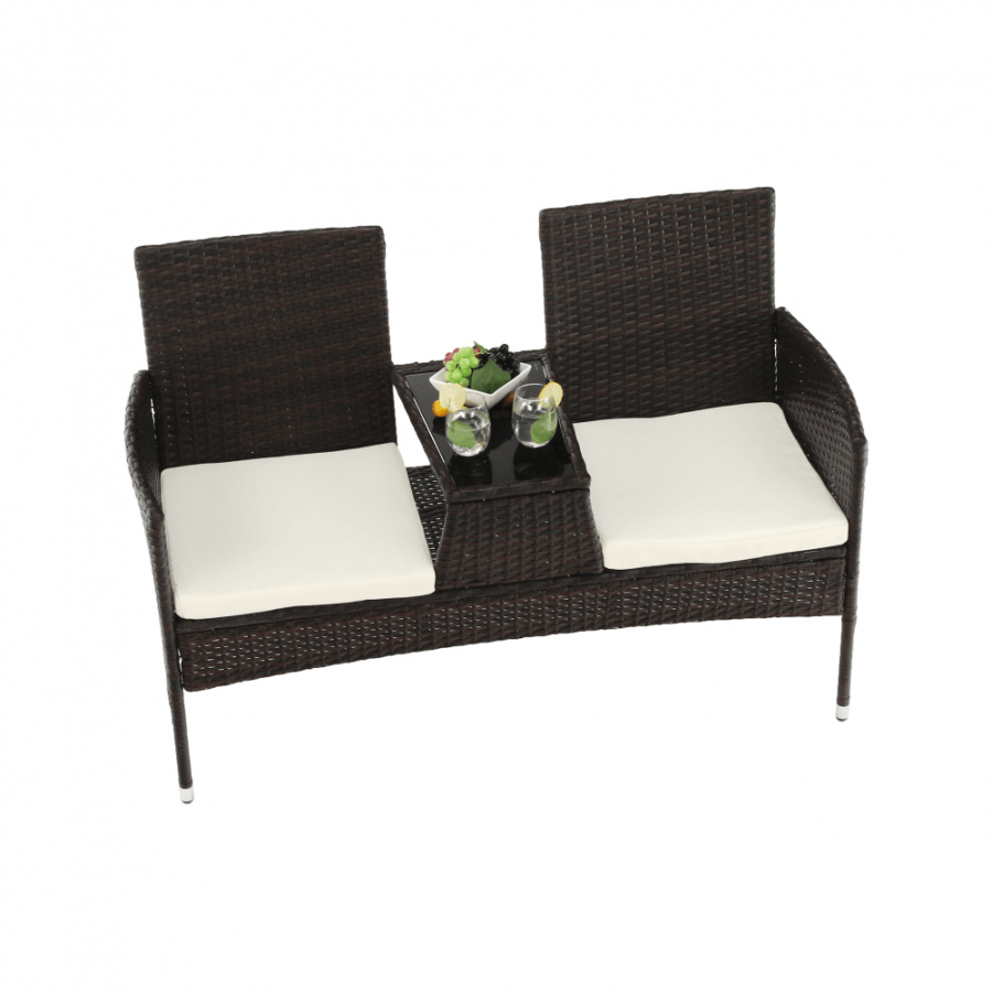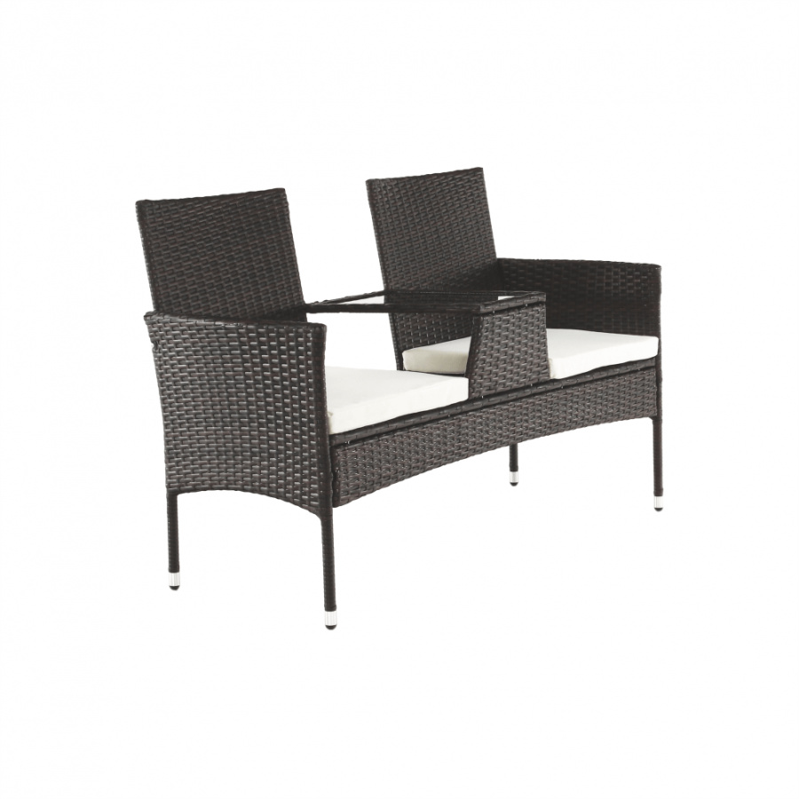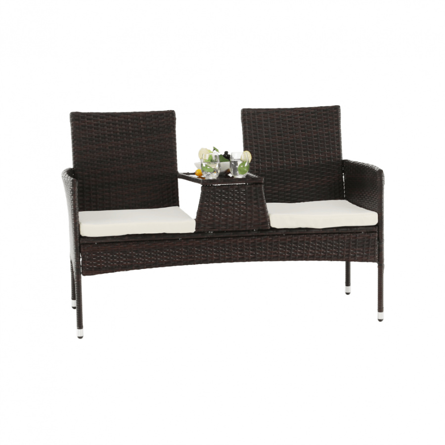 Materiál: umělý ratan / ocel / tvrzené sklo / látka Barva: hnědá / krémová Rozměry (ŠxHxV): 131x60x82 cm Stůl (ŠxH): 25x51 cm Výška nohy: 20 cm Výška sedu: 38 cm Tloušťka polštáře: 5 cm Rozměry sedu (ŠxH): 46x49 cm Opěrka na ruku (HxV): 54x61 cm Opěrka zad (ŠxV): 46x46 cm voděodolný potah snímatelný potah Možné je prát ho v pračce Dodávané v demontu