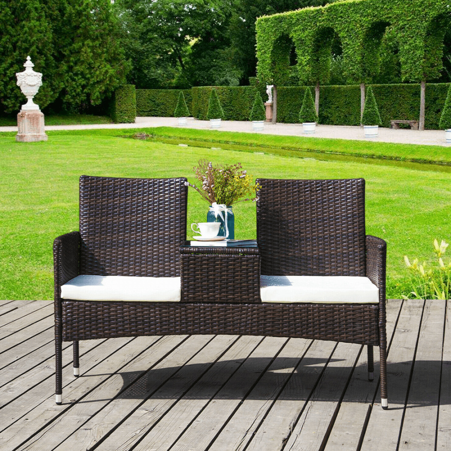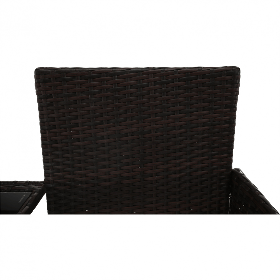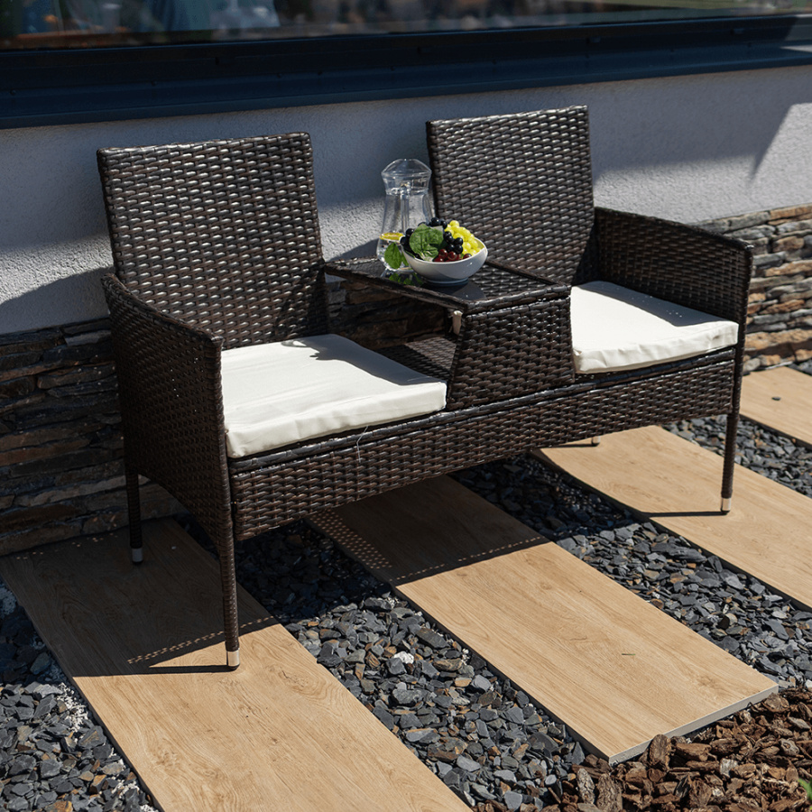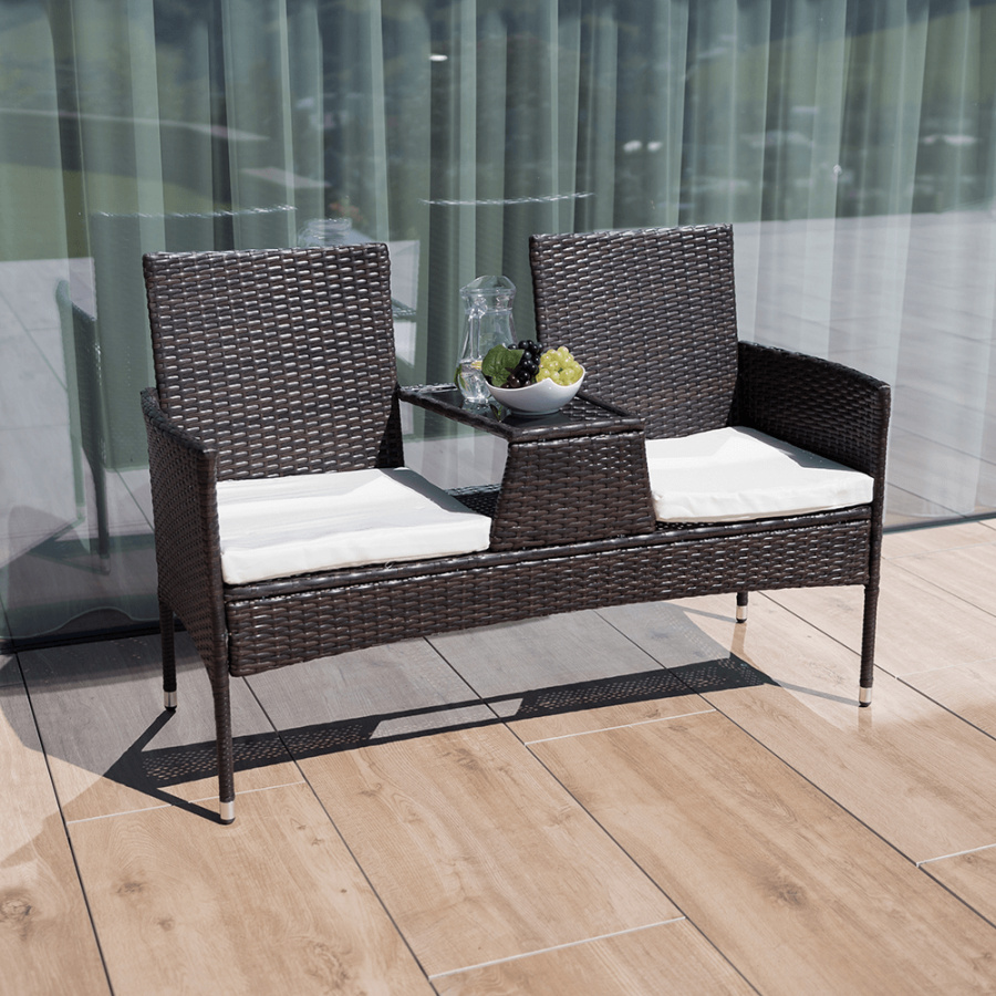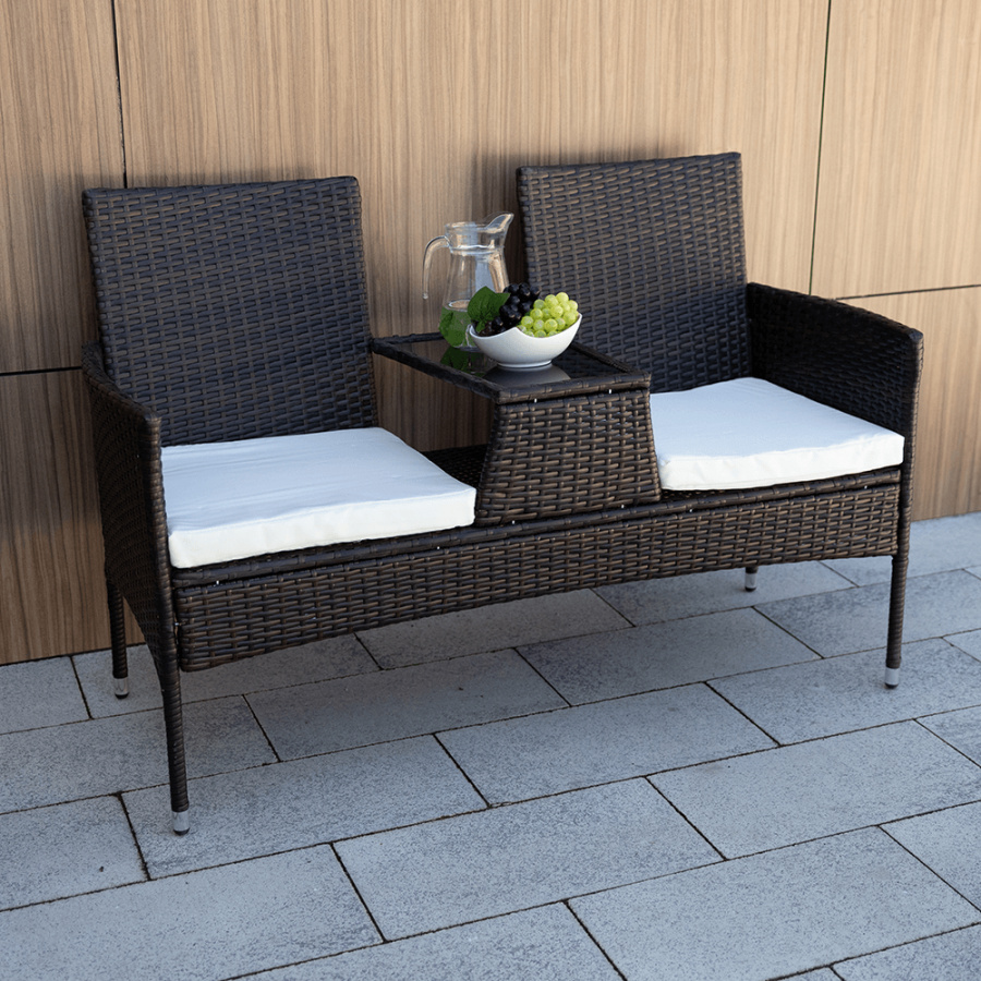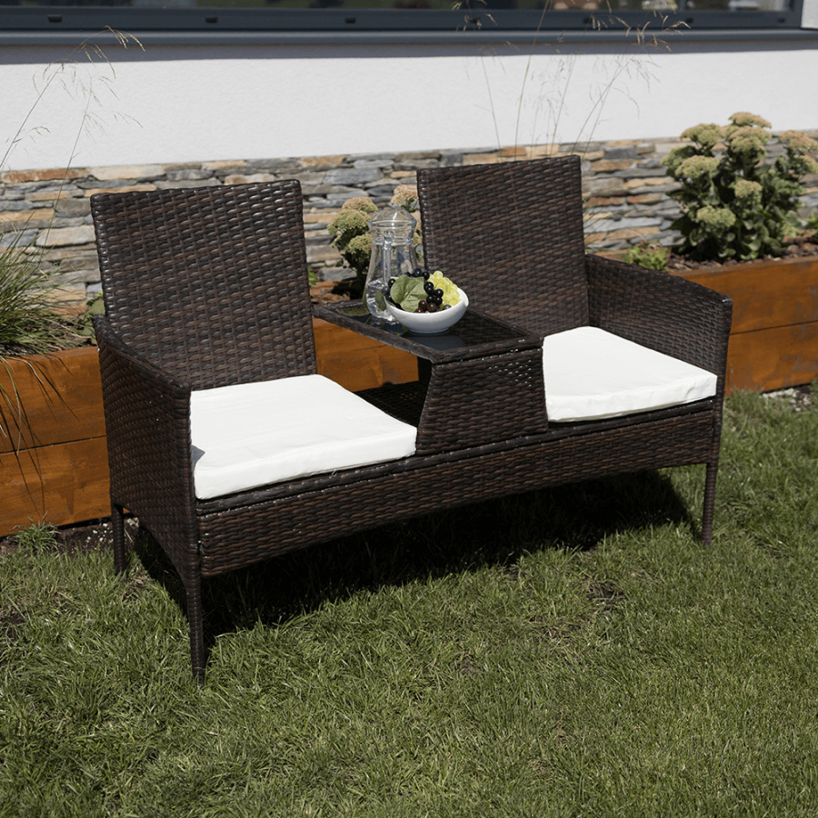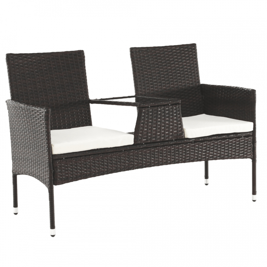Materiál: umělý ratan / ocel / tvrzené sklo / látka Barva: hnědá / krémová Rozměry (ŠxHxV): 131x60x82 cm Stůl (ŠxH): 25x51 cm Výška nohy: 20 cm Výška sedu: 38 cm Tloušťka polštáře: 5 cm Rozměry sedu (ŠxH): 46x49 cm Opěrka na ruku (HxV): 54x61 cm Opěrka zad (ŠxV): 46x46 cm voděodolný potah snímatelný potah Možné je prát ho v pračce Dodávané v demontu