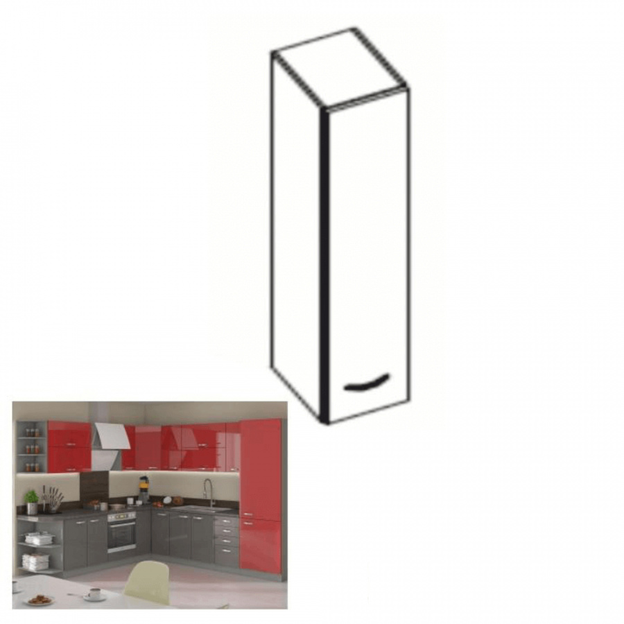 Horní skříňka, materiál: DTD laminovaná, provedení: červený vysoký lesk, rozměry ŠxVxH: 30x71,5x31 cm. Dodáváno v demontu. tloušťka pracovní desky 28 mm, horní i dolní rozměr 2,6 m, dolní skříňky ZZ jsou dodávány včetně pracovní desky a dolní lišty, dřezová skříňka bez pracovní desky. Sektorové skrinky sú dodávané bez pracovnej dosky vrátane spodnej lišty. Možnosť dokúpiť PD travertyn v cene 1.150 Kč/1m. Možnosť dokúpiť univerzálny Ľ/P drez v cene 1.990 Kč.