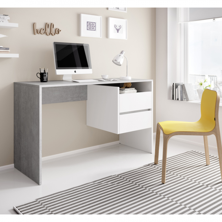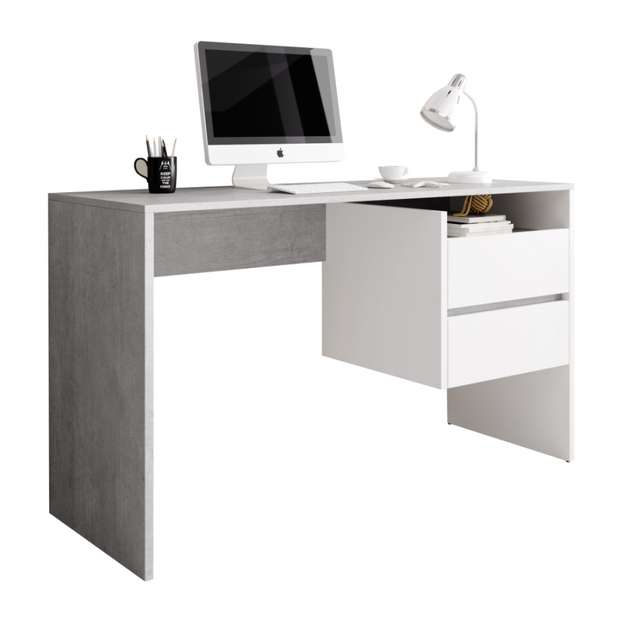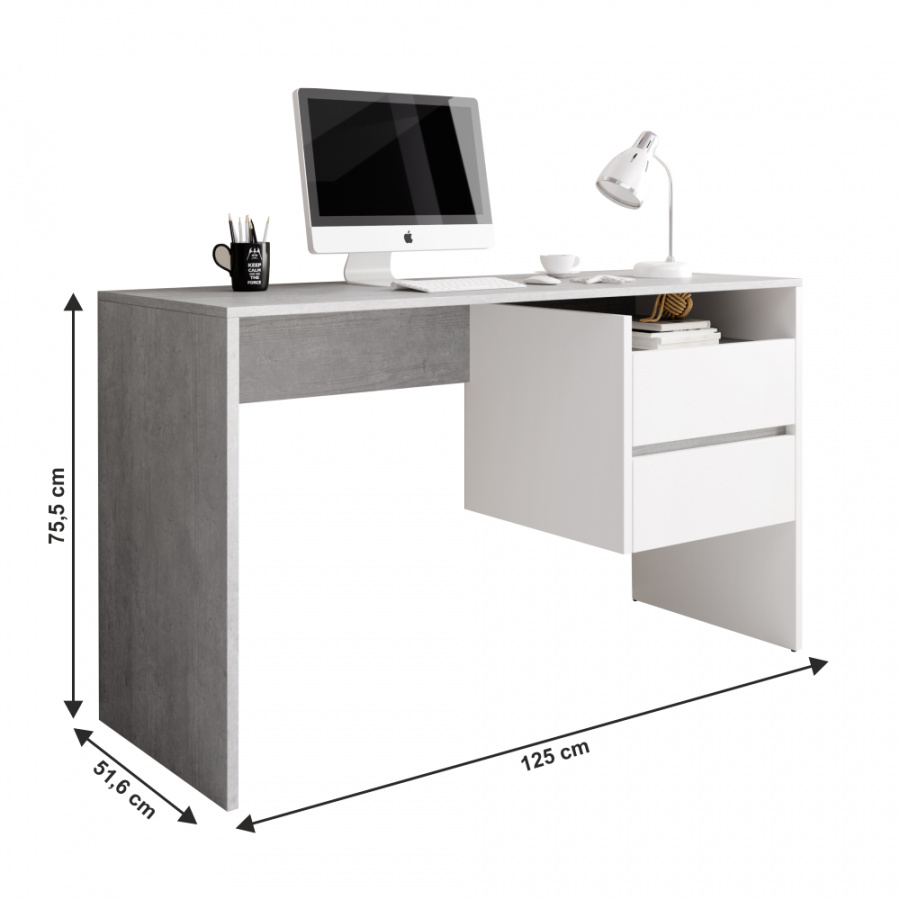 Materiál: DTD laminovaná Barva: beton /bílý mat Rozměry (ŠxHxV): 125x51,6x75,5 cm Tloušťka materiálu: 16 mm Otevřený úložný prostor dva šuplíky Dodávané v demontu