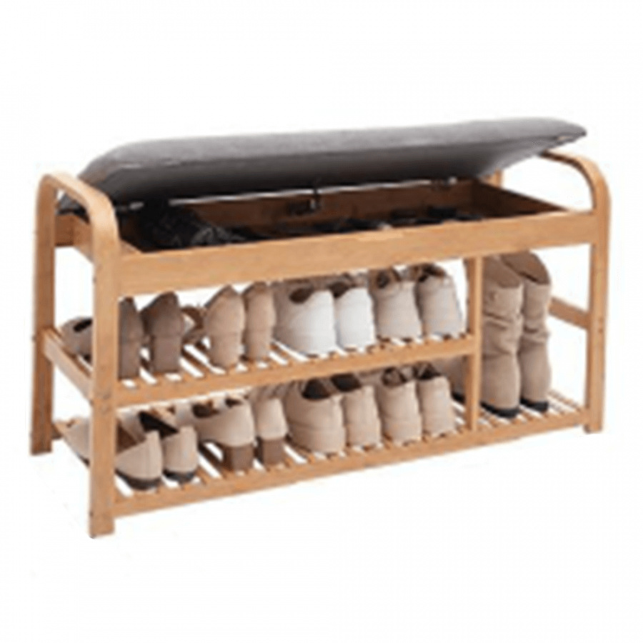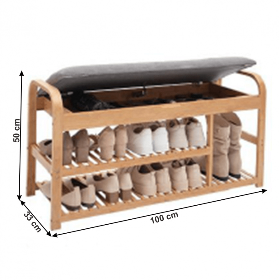 Materiál: lakovaný bambus / látka Barva: přírodní / šedá Rozměry (ŠxHxV): 100x33x50 cm 2-policový S polštářem S úložným prostorem moderní praktický Dodávané v demontu.