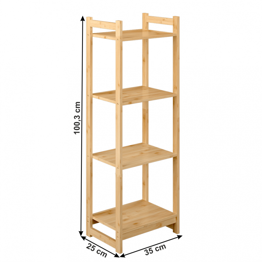 Materiál: lakovaný bambus Barva: přírodní Rozměr (ŠxHxV): 35x25x100,3 cm 4-policový čtyři poličky Víceúčelový Dodávané v demontu