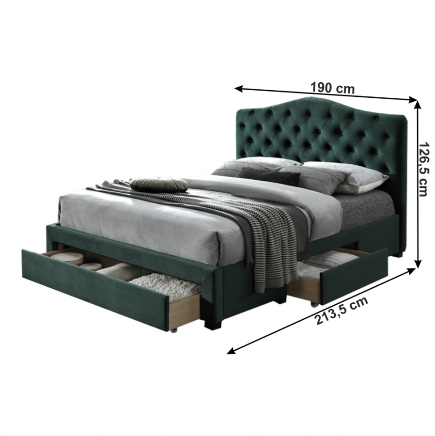 Materiál: Velvet látka Barva: smaragdová Rozměry (ŠxHxV): 190x213,5x126,5cm Plocha na spaní (ŠxH): 180x200 cm Dodávané s lamelovým roštem Nosnost na jedno lůžko: 110 kg S úložným prostorem 3 šuplíky Dekorativní prošívané čelo Dodávané bez matrace Možnost zakoupit matrace z naší nabídky ve stylu Glamour Dodávané v demontu