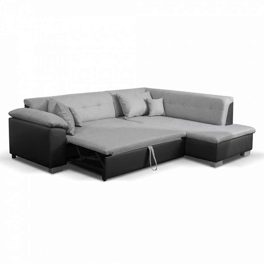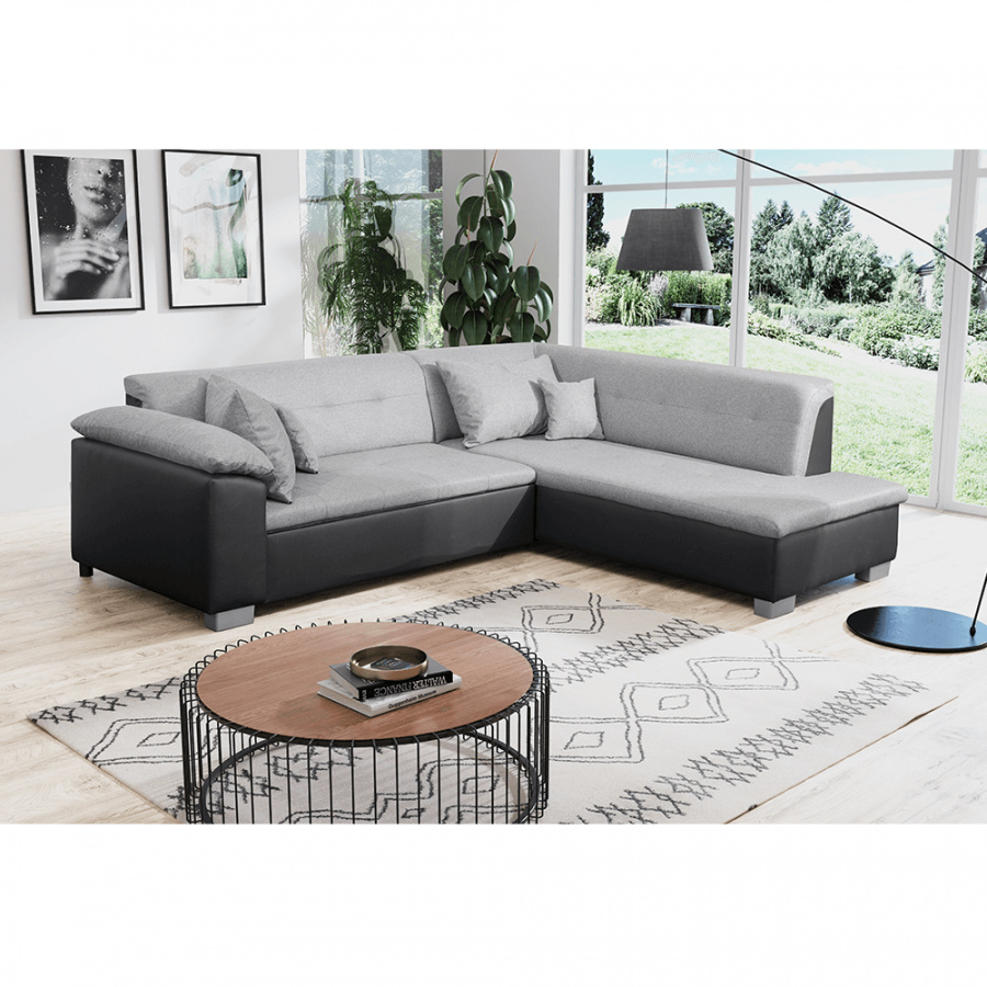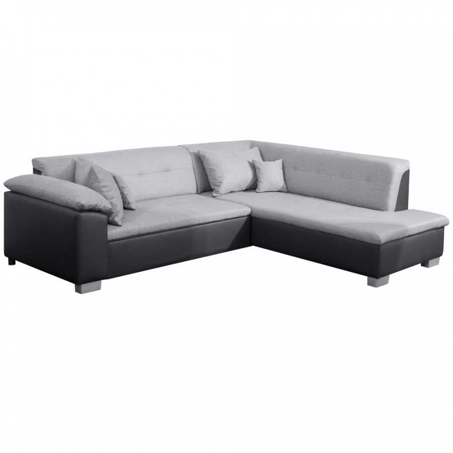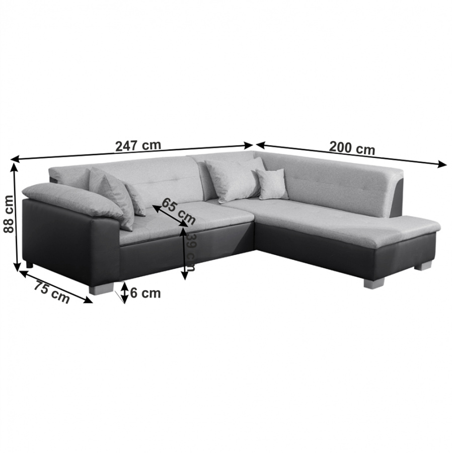 Moderní rohová celočalouněná sedací souprava LEMIX Pravé provedení, Materiál: ekokůže černá 14 / látka Malmo světle šedá 90 Rozměry: (ŠxHxV): 247x88/200x75 cm Rozkládací, rozměry spaní: 132x195 cm Výška sedu: 39 cm Hloubka sedu: 65 cm Výška spodního prostoru od podlahy: 6 cm Dodáváno včetně 4 polštářů. Bez úložného prostoru. Dodávané v demontu.