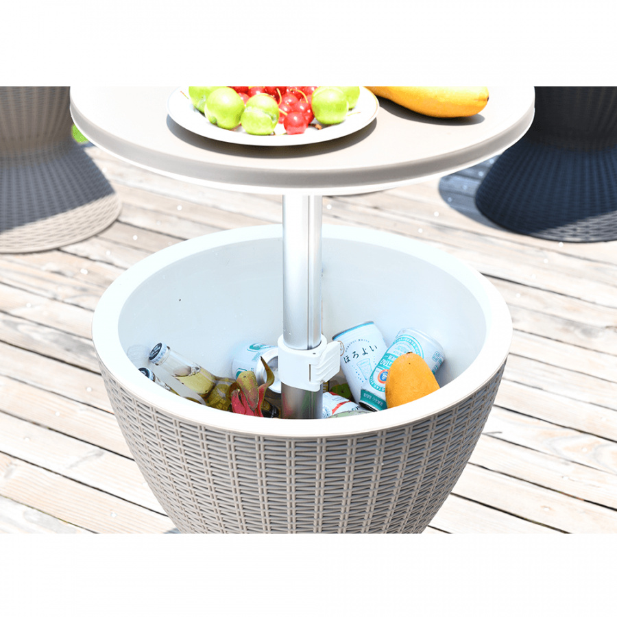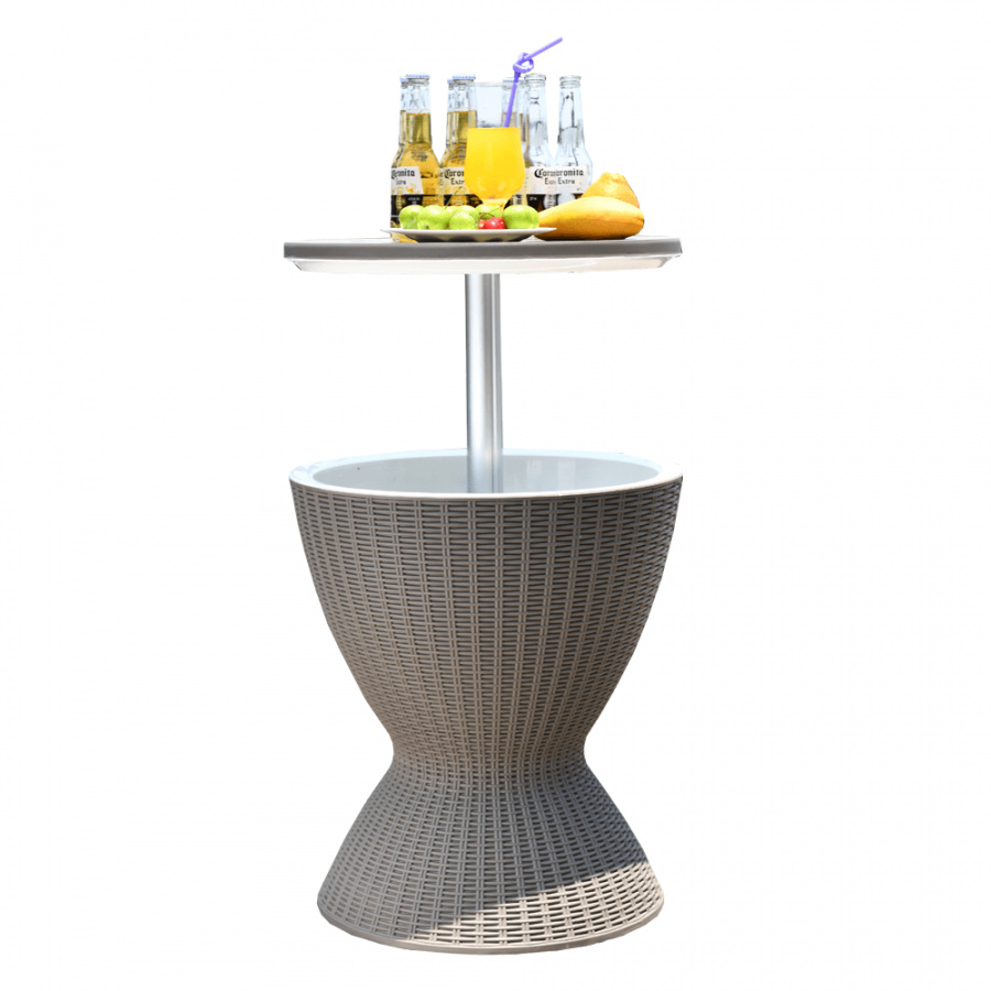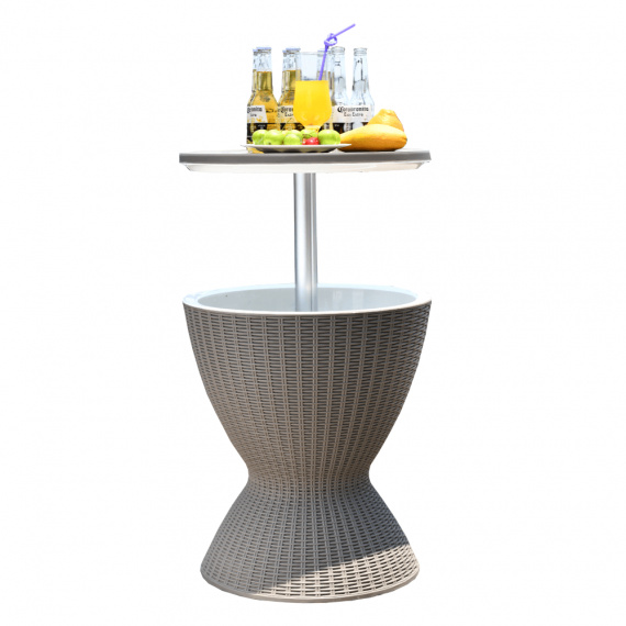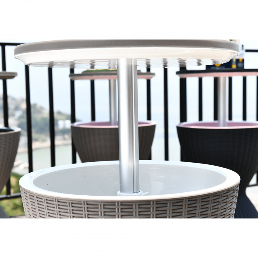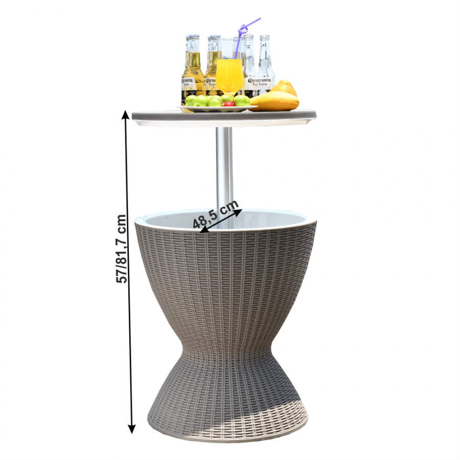 Materiál: plast (polypropylen) Barva: šedá Rozměry (priemerxV): 48,5x57 / 81,7 cm Ratanový vzhled Zahradní chladící stolek výškově nastavitelný Výška stolku se složenou deskou: 57 cm Výška stolku se zvednutou deskou: 81,7 cm Jako konferenční nebo příruční stolek Jako chladící barový pult Chlazení pomocí ledu Nápoje vždy správně vychlazené kvalitní materiál Uchovává si dlouho barvy a svěží vzhled snadná údržba Odolnost proti změnám počasí jednoduchá montáž Multifunkční Označovaný také jako "cool bar" Dodávané v demontu