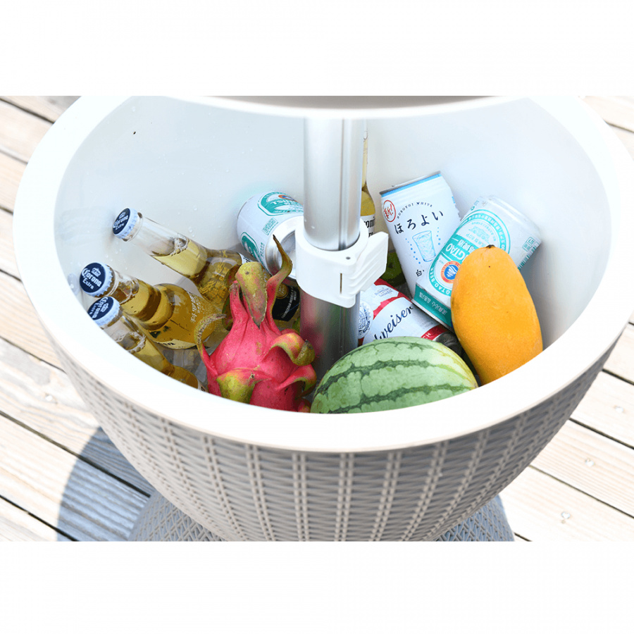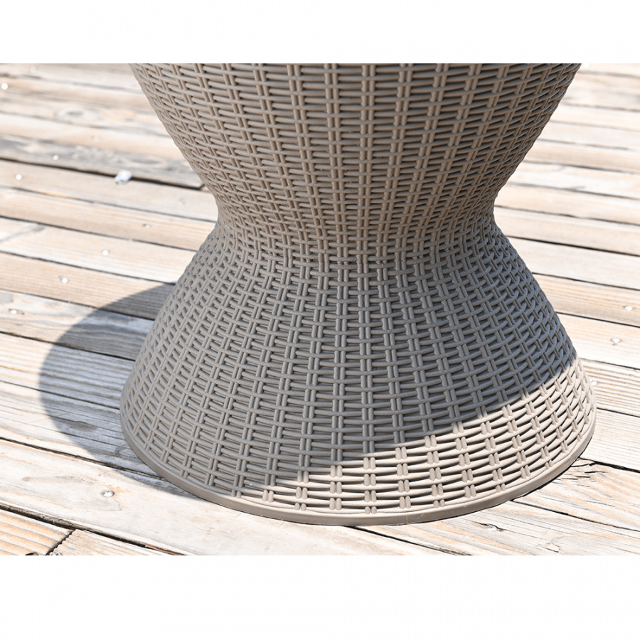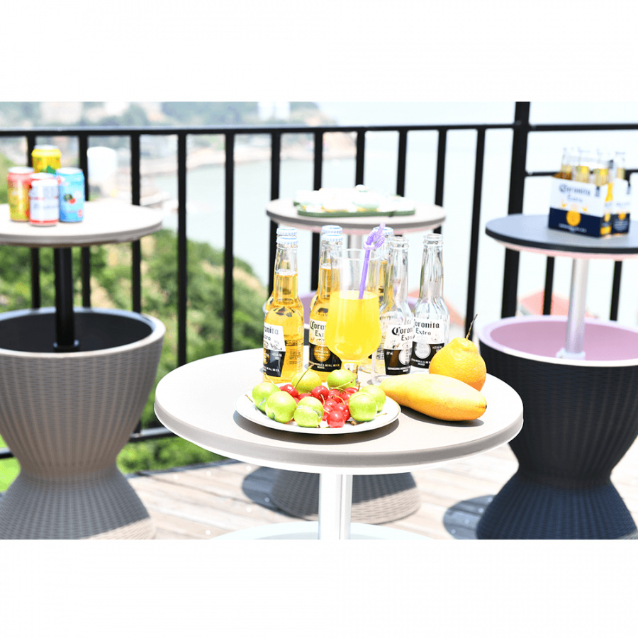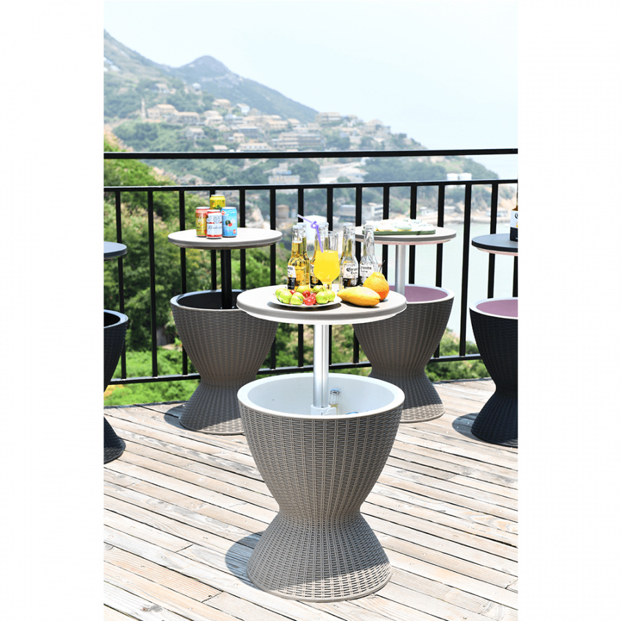 Materiál: plast (polypropylen) Barva: šedá Rozměry (priemerxV): 48,5x57 / 81,7 cm Ratanový vzhled Zahradní chladící stolek výškově nastavitelný Výška stolku se složenou deskou: 57 cm Výška stolku se zvednutou deskou: 81,7 cm Jako konferenční nebo příruční stolek Jako chladící barový pult Chlazení pomocí ledu Nápoje vždy správně vychlazené kvalitní materiál Uchovává si dlouho barvy a svěží vzhled snadná údržba Odolnost proti změnám počasí jednoduchá montáž Multifunkční Označovaný také jako "cool bar" Dodávané v demontu