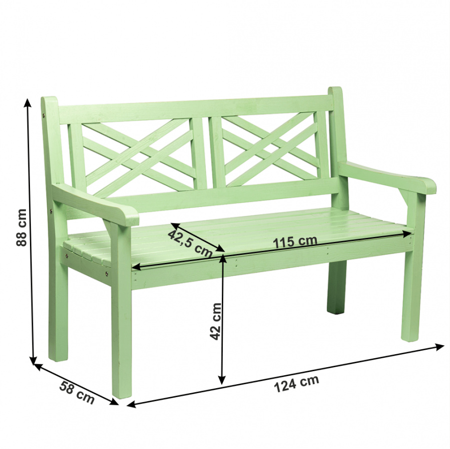 Materiál: dřevo Barva: neo mint Rozměry (ŠxHxV): 124x58x88 cm Výška sedu: 42 cm Hloubka sedu: 42,5 cm Šířka sedu: 115 cm Nosnost: 170 kg Dodávané v demontu.