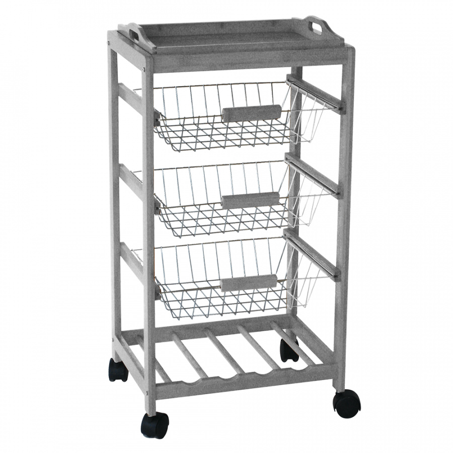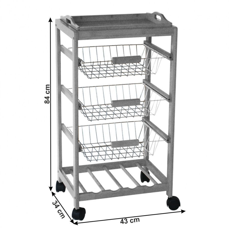 Materiál: masivní dřevo Barva: šedá Rozměry (ŠxHxV): 43x34x84 cm 3 kovové košíky Košíky se dají vybrat odnímatelná tácek Police na láhve na kolečkách Dodávané v demontu