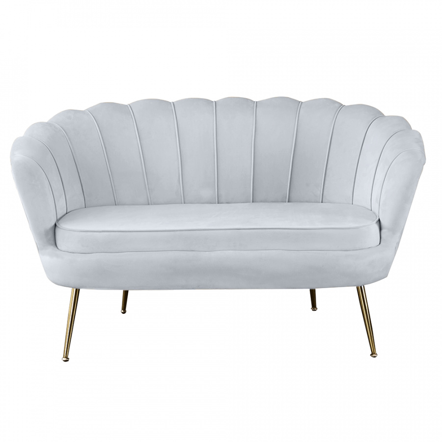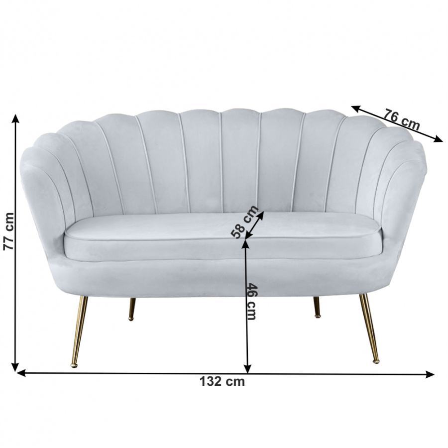 Materiál sedadlo: látka Velvet Barva: šedomodrá Materiál nohy: kov Barva: gold chrom-zlatý Rozměry (ŠxHxV): 132x76x77 cm Výška sedu: 46 cm Hloubka sedu: 58 cm Nosnost: 180 kg designová Ve stylu Art-deco Ve tvaru mušle moderně zpracovaná Dodávané v demontu