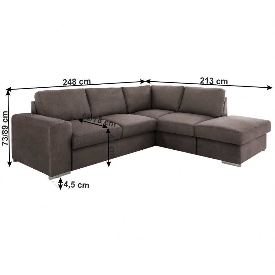 Materiál: látka New York Barva: charcoal šedohnědá Taupe G 004 Rozměry (ŠxHxV): 248x213x73 / 89 cm Plocha na spaní (ŠxD): 200x140 cm Výška sedu: 46 cm Hloubka sedu s polštáři: 60 cm Hloubka sedu bez polštářů: 78 cm Výška spodního prostoru od podlahy: 4,5 cm Barva nožiček: chrom Ve tvaru L pravá rozkládací Dodávaná s 5 polštáři celočalouněná úložný prostor Nosné části z bukového dřeva a dřevotřísky Dřevotříska bez formaldehydů Systém pružení: ocelové zvlněné pružiny Nosag Nosag pružiny dodají sedáku stabilitu a elasticitu Sedací část výplň: PUR pěna / čalounické rouno Zádová opěrka výplň: molitanové vločky Dodávané v demontu