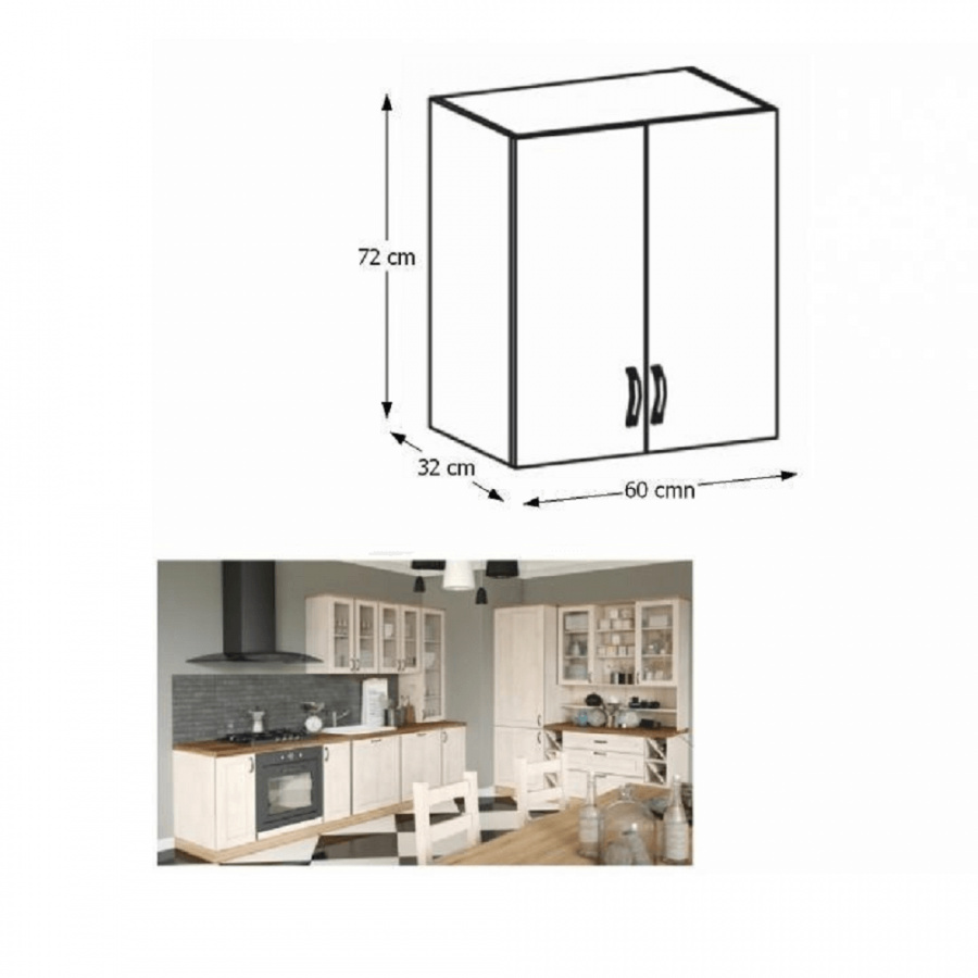 Horní skříňka s dvířky, ROYAL G60 Materiál: korpus je vyroben z kvalitní laminované dřevotřísky / kovová úchytka Barva: bílá / dvířka v provedení sosna skandinávská Rozměry ŠxHxV: 60x32x72 cm Tloušťka materiálu: 15 mm Dodávané v demontu. Spodní skříňky ke kuchyni ROYAL jsou dodávány bez pracovní desky a bez soklu. Pracovní desku v tloušťce 3,8 cm lze doobjednat v ceně 1.240 Kč / 1 bm. Ke každé dolní skříňce, kromě rohových skříněk D25PZ, je třeba doobjednat i sokl v ceně 210 Kč / 1 bm a 2 kusy úchytů na sokl v ceně 20 Kč / 2 ks.