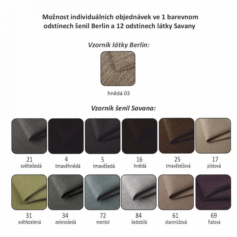 Možnost individuálních objednávek v 2 barevných odstínech šenil Berlin a 12 odstínech látky Savany. Pokud je sedačka v látce Savana nebo v kombinaci těchto dvou látek, cena zůstává nezměněna. Pokud je sedačka celá v látce Berlin, cena sedačky je 10.469 Kč.