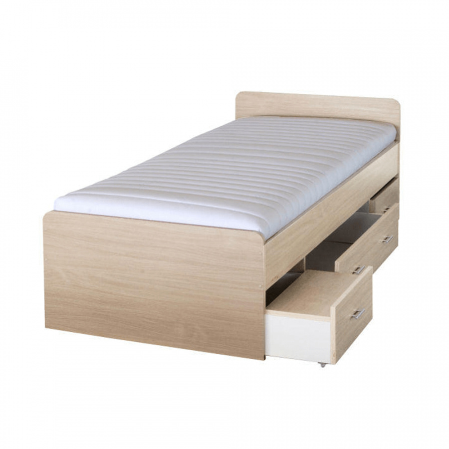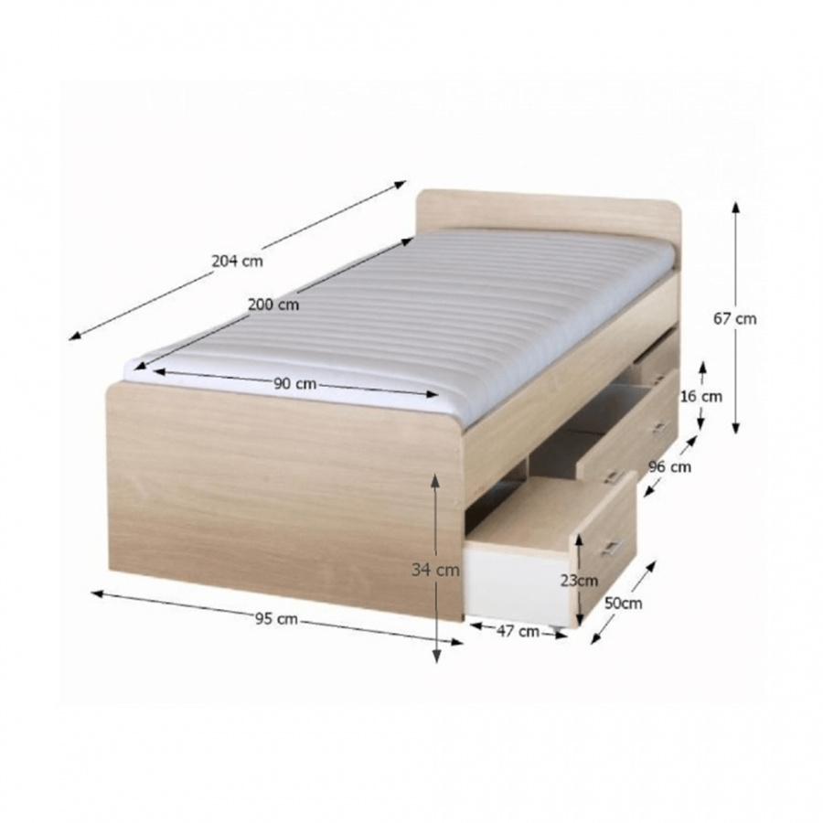 Postel z DTD laminované, DUET Barva: javor, s úložným prostorem - 3 šuplíky. Vnější rozměry (ŠxHxV) 95x204x67 cm. Vnitřní rozměry (ŠxH) 90x200 cm. K posteli doporučujeme zakoupit rošt a matraci o rozměru 90x200 cm. Dodávané v demontu.