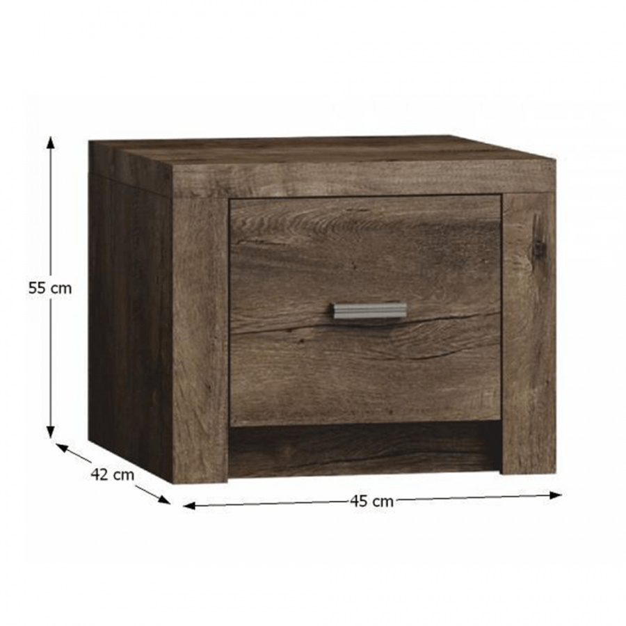 Noční stolek z luxusního sektorového nábytku. Korpus hrubý až 48 mm, Tloušťka materiálu zbývající části: 16 mm, úchytky kovové Materiál: DTD laminovaná / ABS hrany, barevné provedení: jasan tmavý, Rozměry ŠxHxV: 45x42x55 cm. Dodávané v demontu.