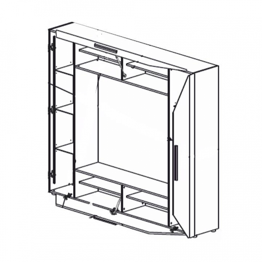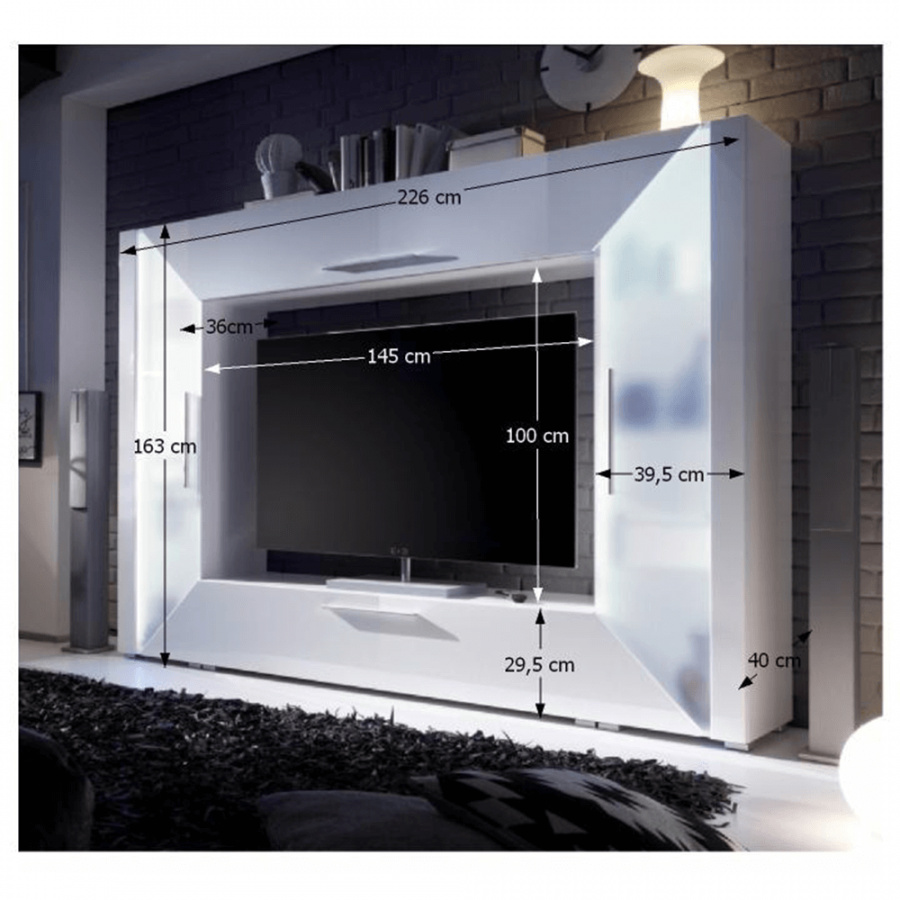 TV a media stěna ADGE Materiál: DTD laminovaná / MDF / sklo Provedení: bílá / bílá extra vysoký lesk HG Rozměr stěny (ŠxHxV): 226x40x163 cm Rozměry prostoru na TV (ŠxHxV): 145x36x100 cm bezpečnostní sklo RGB osvětlení 4 dvířka police Dodávané v demontu