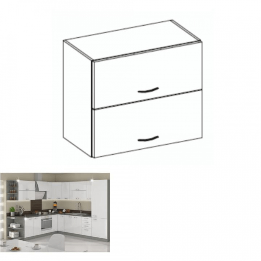 Horní skříňka 80 GU 72 Materiál: DTD laminovaná / MDF / kov Provedení: bílá extra vysoký lesk / šedá Rozměry (ŠxHxV): 80x31x71,5 cm Korpus šedé barvy kovové úchytky Dvířka extra vysoký lesk HG Systém tichého zavírání dvířek Systém tichého dorazu zásuvek Dodávané v demontu tloušťka pracovní desky 28 mm, horní i dolní rozměr 2,6 m, dolní skříňky ZZ jsou dodávány včetně pracovní desky a dolní lišty, dřezová skříňka bez pracovní desky. Sektorové skrinky sú dodávané bez pracovnej dosky vrátane spodnej lišty. Možnosť dokúpiť PD travertyn v cene 1.150 Kč/1m. Možnosť dokúpiť univerzálny Ľ/P drez v cene 1.990 Kč.